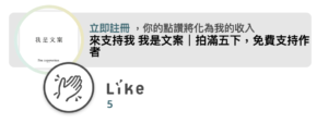 - 每篇文章每個讀者都可以免費拍五次手,但對作者來說免費的讚確實能轉化成收入(登入後才會)