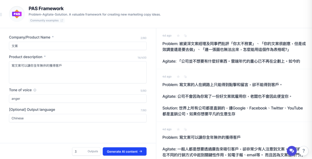 除了語言之外它的選項也很多到有點神奇,除了傳統的寫部落格、寫產品描述之外,竟然直接就有行銷常用的AIDA框架、PAS框架,連facebook廣告貼文、Google廣告、IG、YouTube、Amazon都有,剛剛說的中文支援雖然還沒有全部開放,但大約有半數以上都能支援。