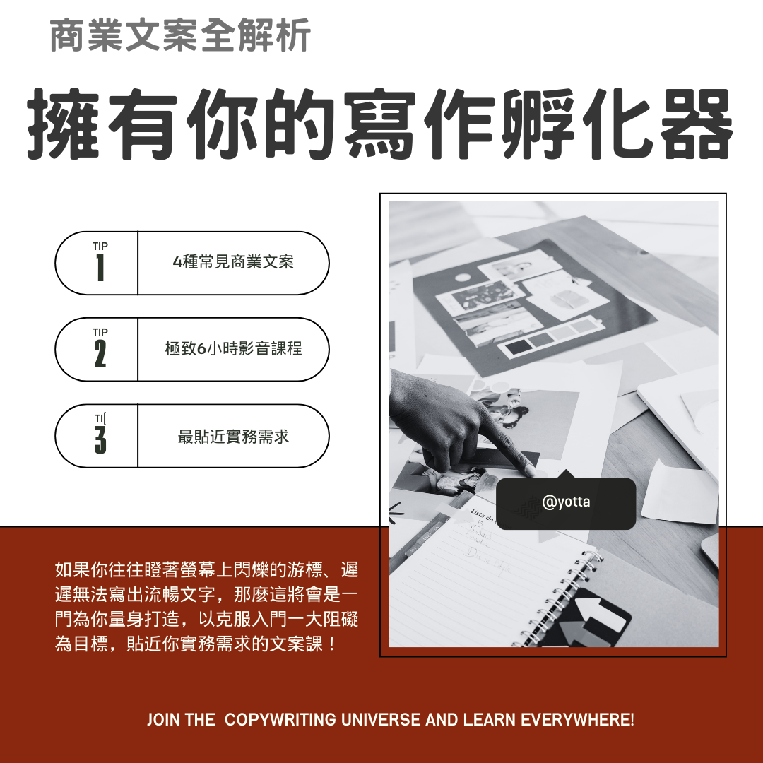如果你往往瞪著螢幕上閃爍的游標、遲遲無法寫出流暢文字,那麼這將會是一門為你量身打造,以克服入門一大阻礙 為目標,貼近你實務需求的文案課!