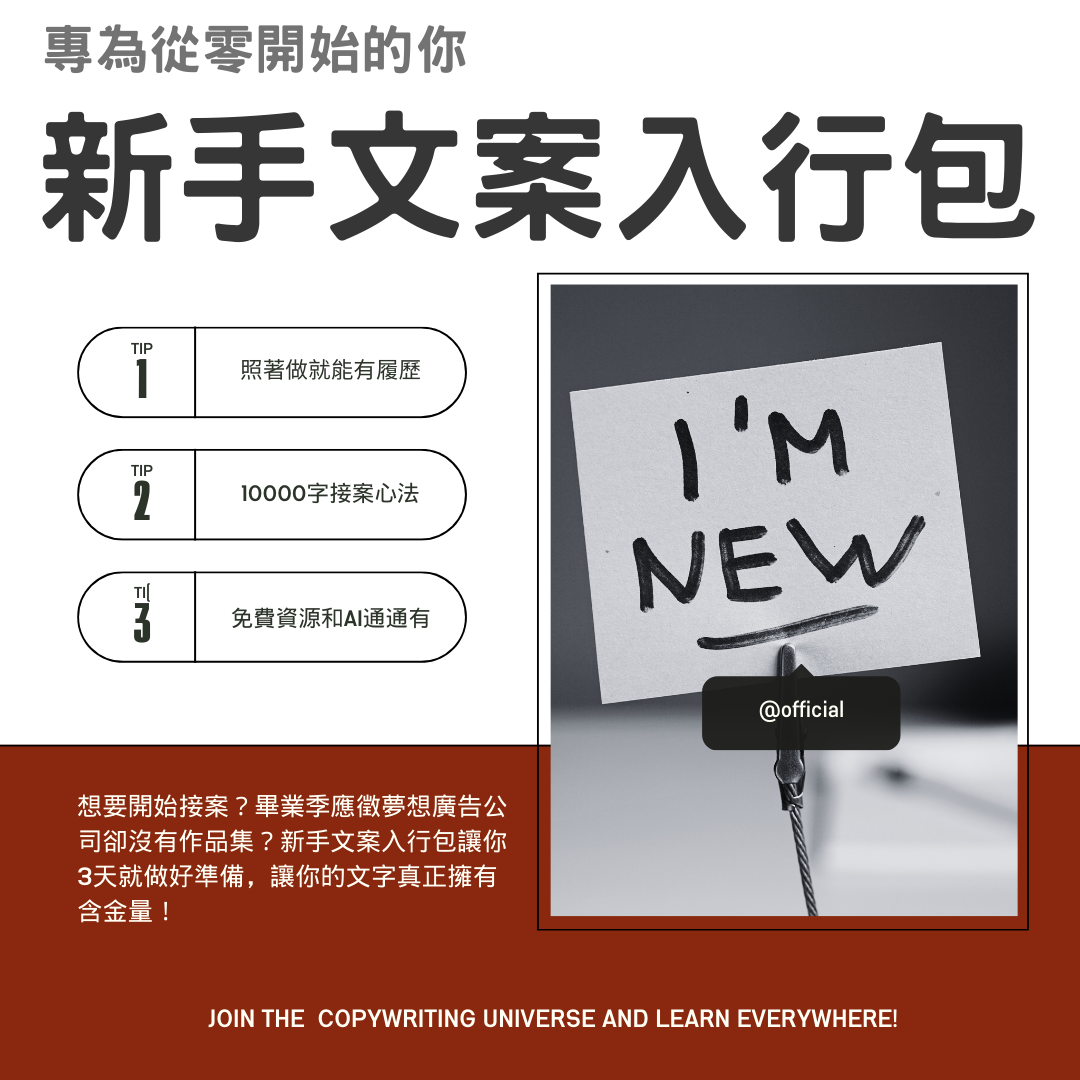 因此,我才在這個既是畢業季又是居家防疫的期間,推出新手文案入行包,希望你能藉由這項教材: