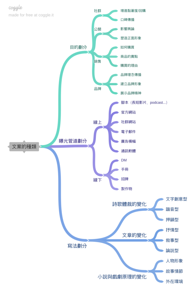 有些教學,會把文案依照寫法的類型來區分。這也是一種分類方式,但是這樣的分類方式主要著重的目的是供學習用途,而不是實際商業應用情境上面。例如藏頭型、諧音型、押韻型,透過這種分類你可以掌握自己比較擅長的文案寫法,但是你的商業客戶不一定需要知道這些事情,他們更關心這樣寫能達到什麼效果,效果也是我們較需要跟客戶溝通的部分。